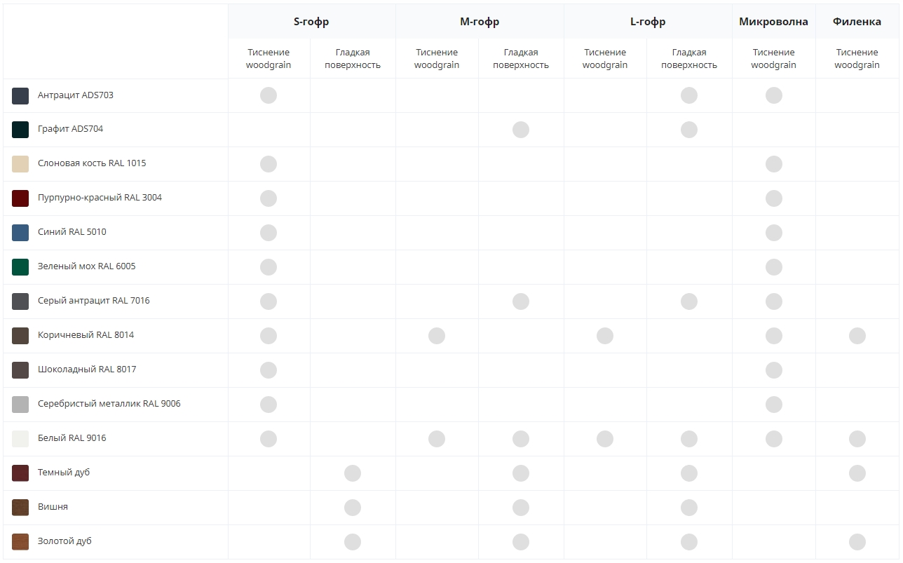 * Woodgrain доступна для панелей с рисунком S-гофр, M-гофр, L-гофр, микроволна, филенка.